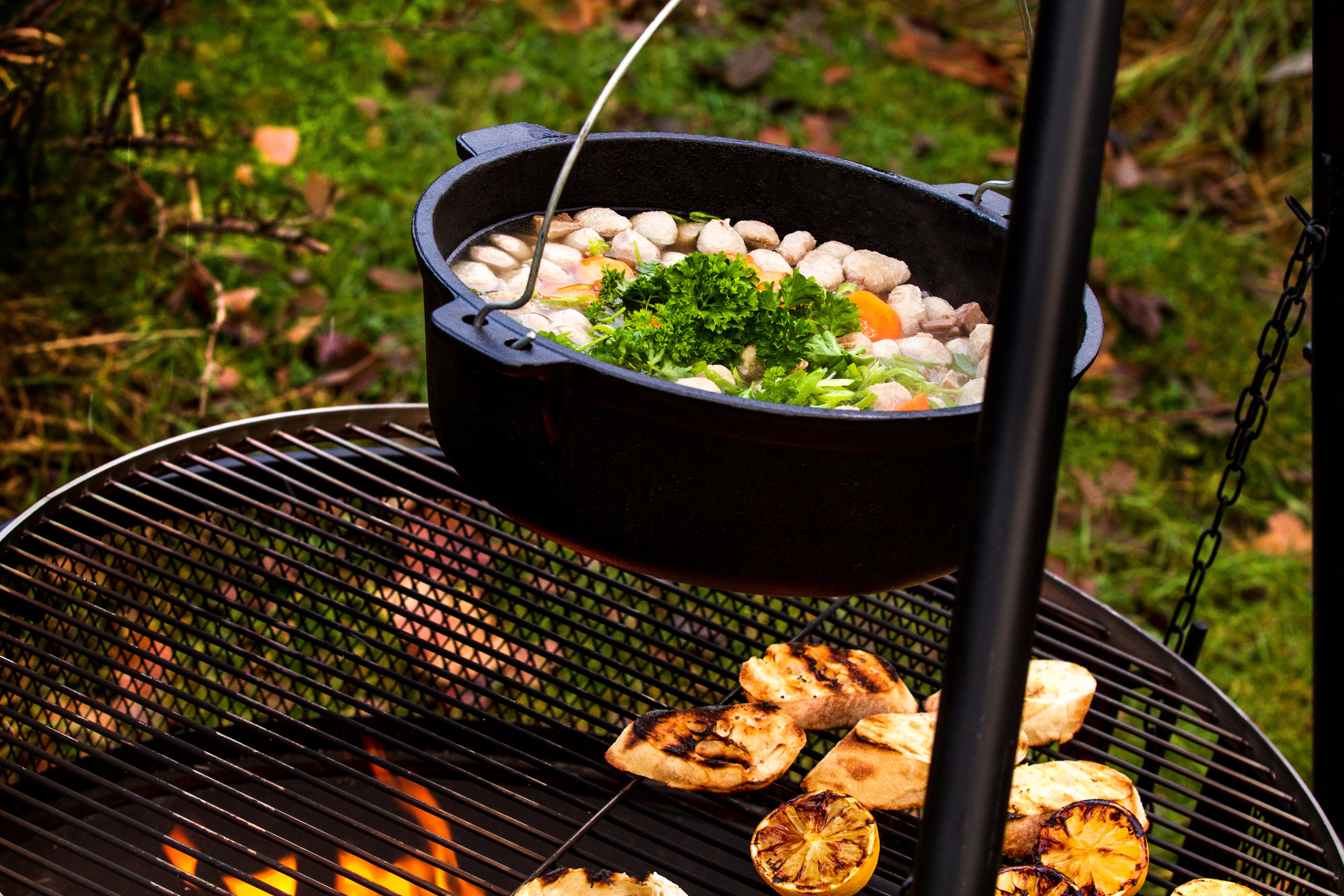 Gryta: Laga en härlig gryta över elden. Använd en stor gjutjärnsgryta och fyll den med ingredienser som bönor, kött, grönsaker, buljong och kryddor. Låt det sjuda försiktigt över elden tills allt är mört och smakrikt.